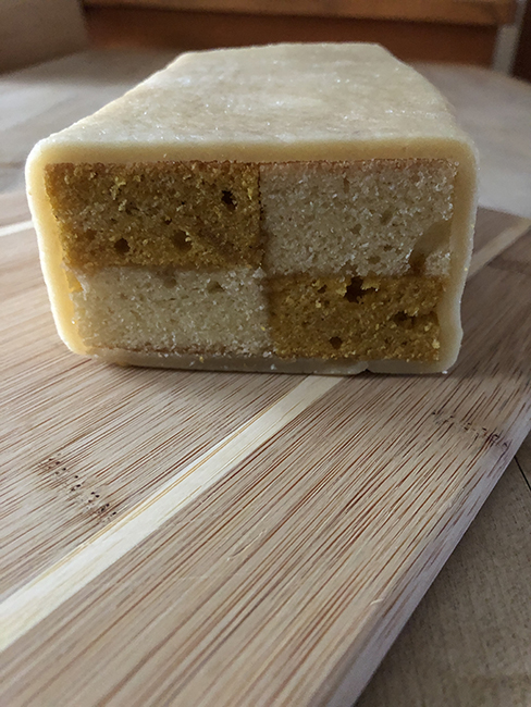 This recipe is adapted from an original by Lottie Bedlow, @lottiegotcake who was a contestant on the Great British Bake Off in 2020, series 11 in the UK, series 8 in the US. The contestants had to live in a pandemic bubble. And oh gosh, I was inspired to make Battenberg cake by that series. Lottie’s had rhubarb; mine was pumpkin.