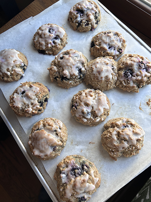Make the glaze while the scones are baking. Combine the confectioners’ sugar and lemon juice in a small bowl. Add the maple syrup, and mix until you have a thick but spreadable glaze. When the scones are baked, remove them from the oven and brush the glaze over with a pastry brush while they are still hot.