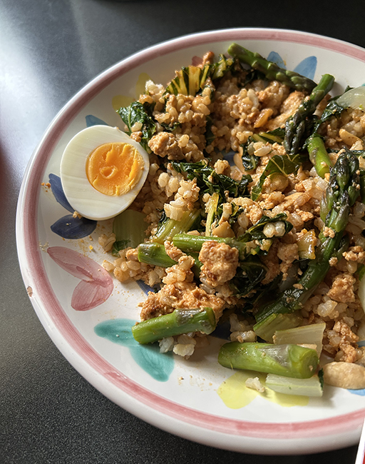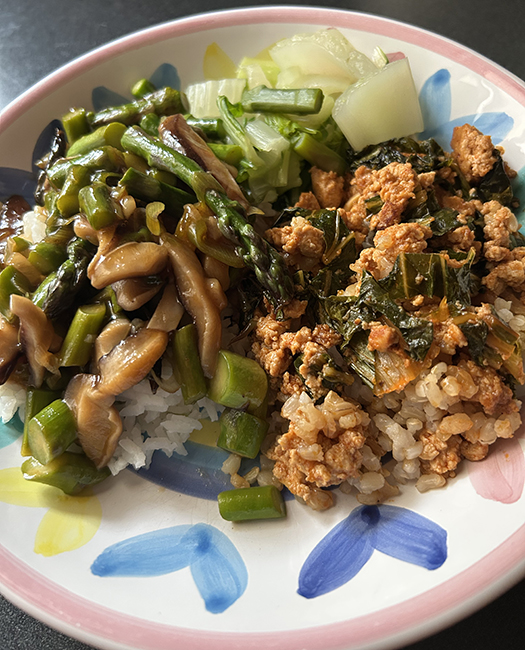 Thursday there were two interviews, one in-person and one remote. After the in-person one, I dealt with one of my minor mishaps, the shifter on my old Giant had started slipping on the handlebars, making it really hard to shift gears. I had Ian tighten it up, but it started slipping again. I decided to take it in to the bike shop on my way home, and no shade on Ian, turns out it was cracked. I walked home from the bike shop and was in time for the online interview. I picked up box 2 of our 6 week CSA season, and made a stirfry with asparagus and shiitake mushrooms, that we ate with leftovers of the tofu bowls from Monday.
