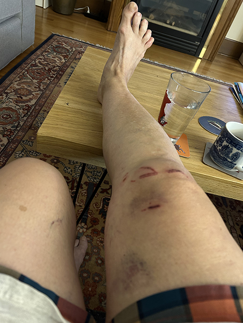 Saturday brought another minor mishap. I went to the Farners’ Market early, and I was pulled up to the curb trying to get off my bike, the Liv that’s a little too big for me, at a funny kind of uphill bike parking rack, and I tipped over and ended up in the gutter with my bike on top of me, and scratched up and bruised my leg. I’ve parked there before – it’s near my former dentist and the credit union, which is why I was going there Saturday, to get cash hoping to buy strawberries at the market. I was so embarrassed, I didn’t notice that the handle bar shifter on this bike was cracked and the little plate that has the numbers fell off. And that’s what scratched up my leg. It still shifted just fine, but no numbers indicating the gear, the top was open and rain could get in, and it was a sharp thing on the handlebars.