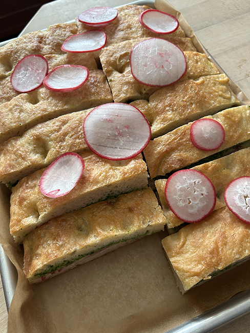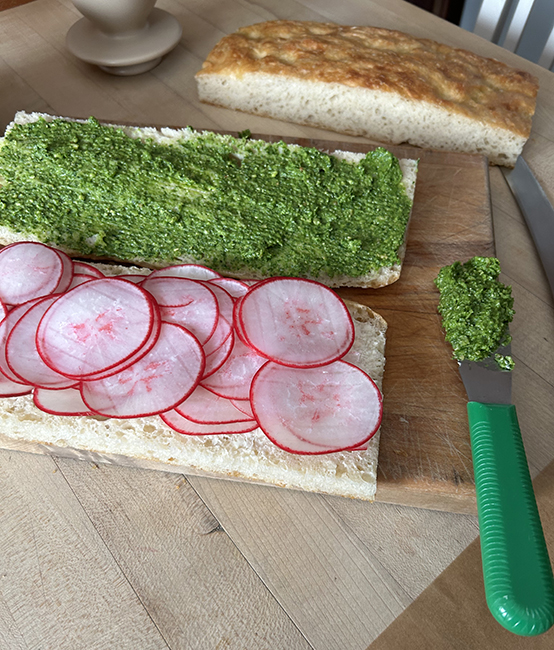 Monday started off pretty normal, went to campus for the last interview, and worked in the basement of the library selecting books for just a bit, then my plan was to drop the Liv off when I picked up the Giant. That all worked just fine. We were invited to a friend’s retirement party and the invite said bring appetizers. I had an abundance of radishes from CSA boxes 1 and 2, with more coming in box 3, and I made green garlic and arugula and spinach pesto, so I thought I made focaccia and radish sandwiches with pesto. I’ve been trying to get this super easy focaccia recipe to work, and I keep flubbing it. Maybe because I mixed it Sunday night after we got back from the ballet, I didn’t put enough water in the first batch, so it didn’t rise so well. I over baked the second batch, but that’s the most recent disappointment. The mishap was while making the radish sandwiches, I shaved off a chunk of my thumb along with the radishes. Barehanded on the mandolin. Rookie move, I should know better. I didn’t have enough appropriate supplies to bandage it with so I wrapped it in a sanitary pad and drove over to Walgreen’s and spent $50 on band aids and gauze squares and tape. It seemed like it wouldn’t stop bleeding so I called the urgent care and got a triage nurse who recommended the ER if it really wouldn’t stop. And asked, “Did you sit down and put pressure on it?” And I realized of course I hadn’t. I bandaged it and then put a glove on and finished the sandwiches and cleaned up and it bled through. I had Mark help me do a better bandage and we took the sandwiches to the retirement party and figured we’d go to the ER after. I went in to the party, congratulated the honoree, and transferred the sandwiches to one of her platters so I could take mine home. And realized that the bleeding seemed to be if not stopping at least slowing. So we went back home and relaxed and I kept elevated, and I really don’t think the ER was necessary. Though it was scary to change the bandage Tuesday night and see how much blood there was. The sandwiches are pretty though.