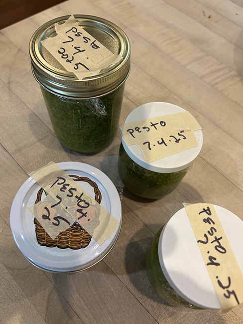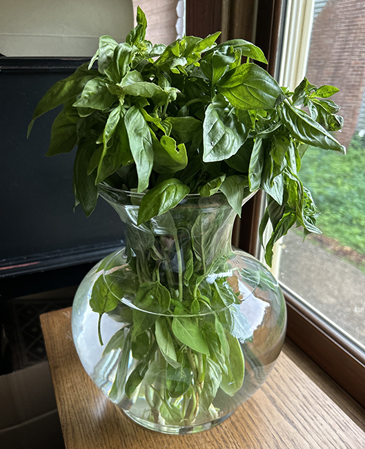 I made all this basil into four jars of pesto. Unfortunately, when I was putting it into the freezer, I dropped one of the jars, one of the little ones with the white tops, and smashed it. So one down, and not a very fun cleanup, either. Then the next morning when I was putting the vase away on a high shelf in the basement, I noticed a crack in its lip. When I grabbed it to bring it down to look at more closely, a piece snapped off in my hand. So into the trash with it. I think it was given to me for School Woods by one of my gay librarian friends. It is much more dramatic than any other vases I own.