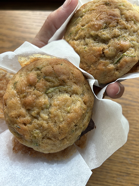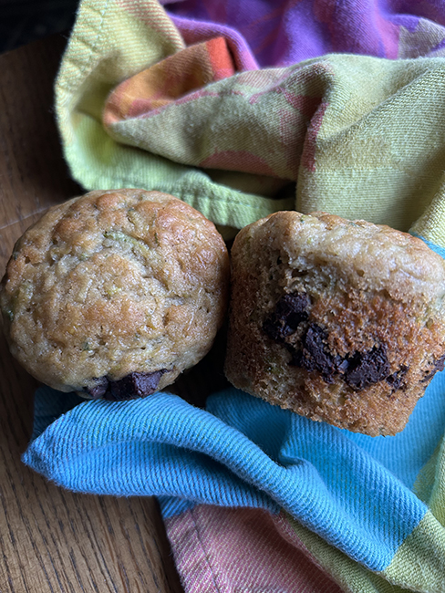 I also started to use up my double zucchini in some muffins that are a Justine Doiron recipe, with a chocolate swirl. I made them once before with olive oil as she directs, and didn’t really like the taste of the olive oil, although it mellowed and I think helps make the muffins keep longer. And I ran out of chocolate. So this time, I used safflower oil (I am sticking with dread seed oils, MAHA be damned, a 1/2 cup of safflower oil in a dozen muffins will not kill me, and I bet is healthier in some respects than butter). Anyways this time a few of the muffins seemed to have too much chocolate, and I wanted them to be a bit taller and rounder on top. But overall, they were OK.