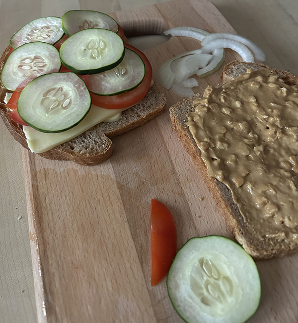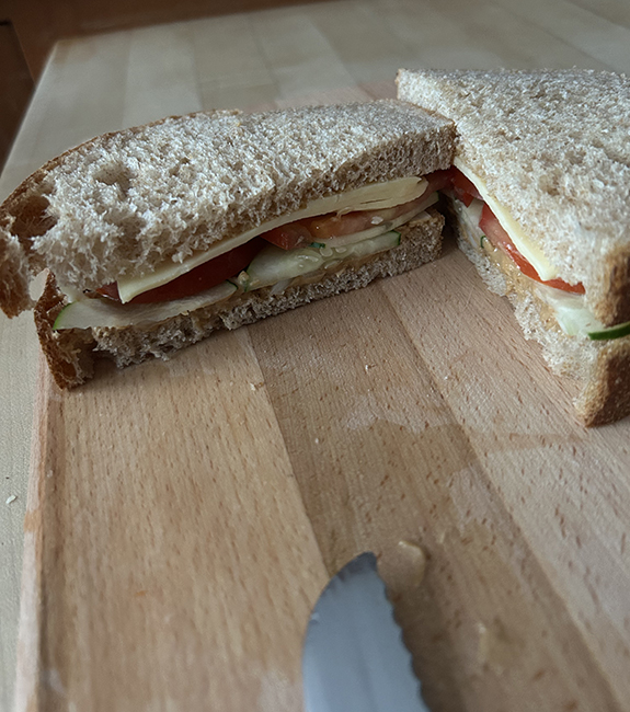Oh, and another thing that came out better – I had tried this Sally’s Baking Addiction soft whole wheat sandwich bread, and I tried to rise it in the fridge and that killed it. It was underdone on the bottom too. I ate some of it, and I made some of it into toast for Jasper, cutting the bottoms off, and about 1/3 of the loaf went in the compost. But I tried again yesterday and it’s perfect. Kind of a bloomer loaf – big bloom of dough over the top of the pan – and nice and soft. So for Saturday after the market brekkie I had my first Diane’s Dad’s Summer Sandwich of the season, with cukes still from CSA, and tomatoes and white cheddar from the market, and peanut butter and onions from my pantry.