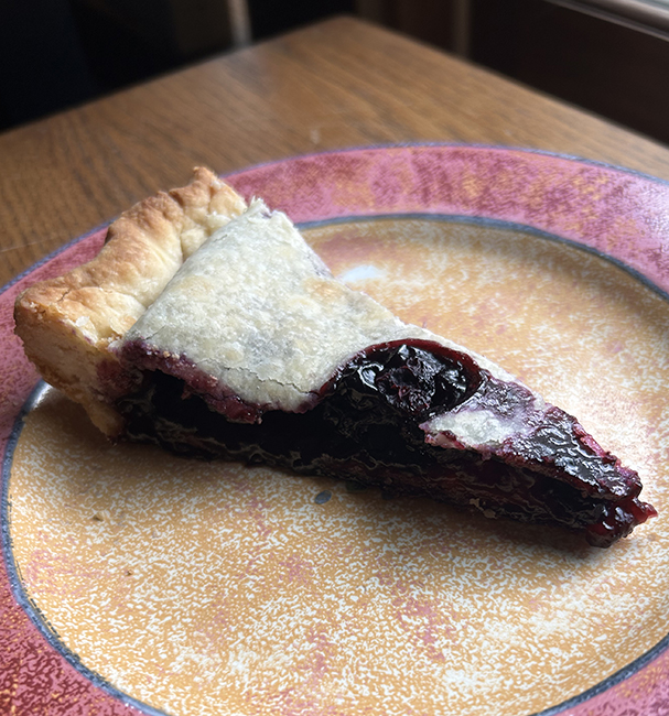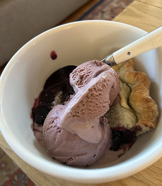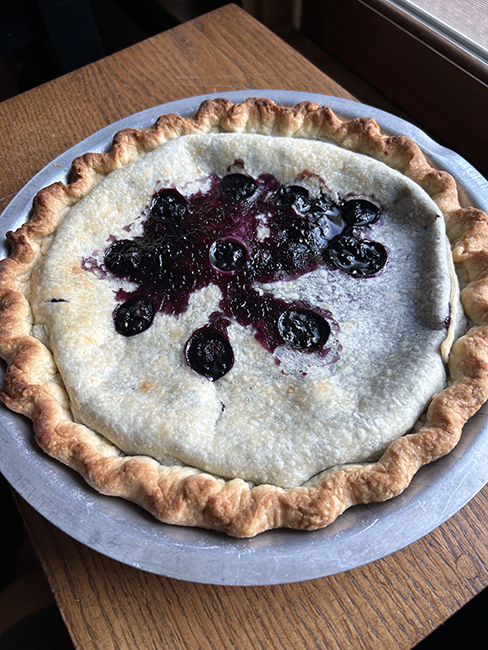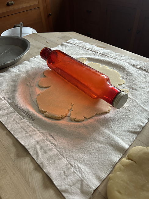 I told you that when I was in Pittsburgh I was gifted an orange glass rolling pin, from my old high school boyfriend. On 4th of July, I used it to roll out the crust for a blueberry pie. Which turned out a little funny. I rolled out the bottom crust with the glass one and then switched to one of my wooden rolling pins to roll out the top crust and rolled it too thin. Maybe because the wooden rolling pin required less pressure than the glass one, or because I normally make a lattice crust with a berry pie, or just who knows …. Anyways, the too-thin top crust puffed way up in the oven and the filling leaked. My pattern of small circles punched out with a pastry bag tip turned into, I dunno, a cypress tree? It tasted good when we ate it with ice cream on 4th of July night, though.