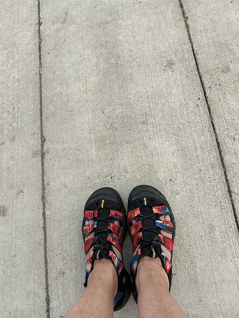My Garcia sandals waiting for the bus to go pour beer at La Fete de Marquette – that was closed down at 8:30pm due to rain. This was Thursday night and I expect Friday was worse.