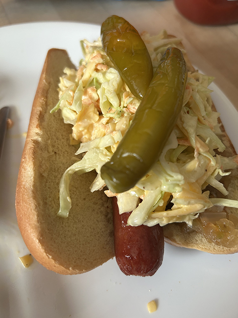 For dinner on 4th of July we had hot dogs, with Hailee Catalano’s cheese slaw. Could be categorized as another using up the double CSA boxes dish, because I got two heads of cabbage and the slaw used up 2/3 of one. The slaw was really good the first day, but less so when I ate it on another dog for dinner after we came back from the Madison Mallards baseball game rainout. Like the Pirates Grateful Dead night, it was another special night, with jerseys, the Mallards playing as the Neverminds, in honor of Nirvana demoing what became their Nevermind album at Smart Studios 35 years ago. The Mallards scored 10 runs in the first inning, and the rains came shortly thereafter, when I was at the store buying our jerseys. I waited at the store undercover and Susan and Mark came to meet me, and we went home, although the game did resume after about an hour rain delay, and the Mallards won 17 to 2.