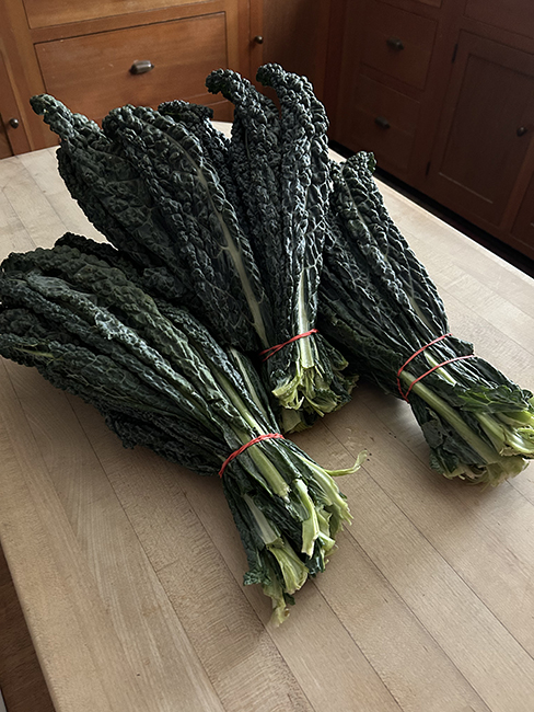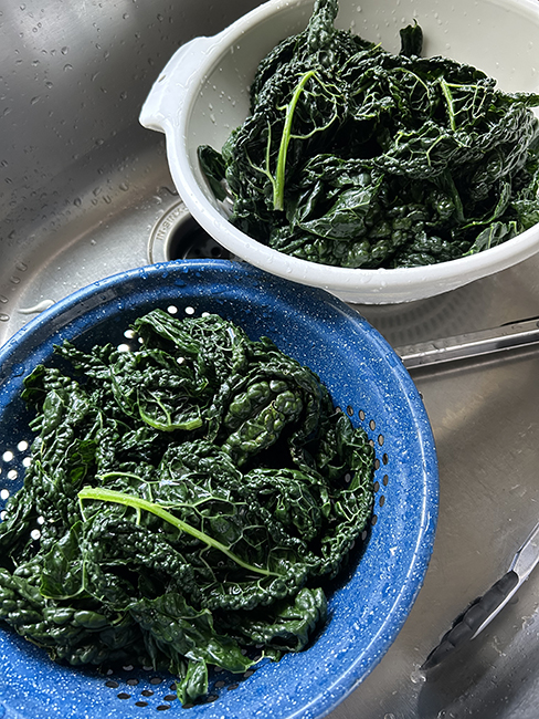 I blanched kale and froze it for future greens gratins or kaleakopita (make spanakopita and don’t tell anyone it’s kale rather than spinach and mixed in with all the feta cheese and herbs and onions, they can’t tell).