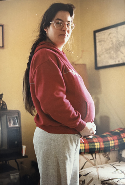 Here’s me using a WORT hoodie (tho we called them sweatshirts back then) as maternity wear. This is as big as I got – it’s the Sunday before John was born the following Wednesday.