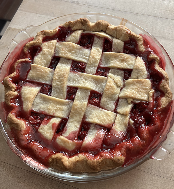 So, to close, here’s a cherry pie I made the Sunday after Spooner because some friends brought me a bag of cherries from their tree. It was just about perfect – sweet, but you could still taste the tartness of the cherries. I took them a hunk on my way to yoga last Tuesday.