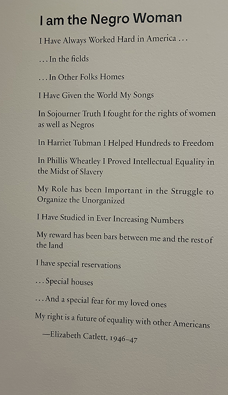 One of the things I liked the best is the series of prints Catlett made, published first in the ’40s as I am the Negro Woman, and then again as I am the Black Woman in 1989. The titles of the prints make a poem. I put in the first version, because you can see how many places all the prints came from. I’m sure it must be a book, too.