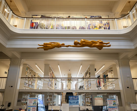Floating Family belongs to the city of Chicago and hangs in the Legler Library on Pulaski