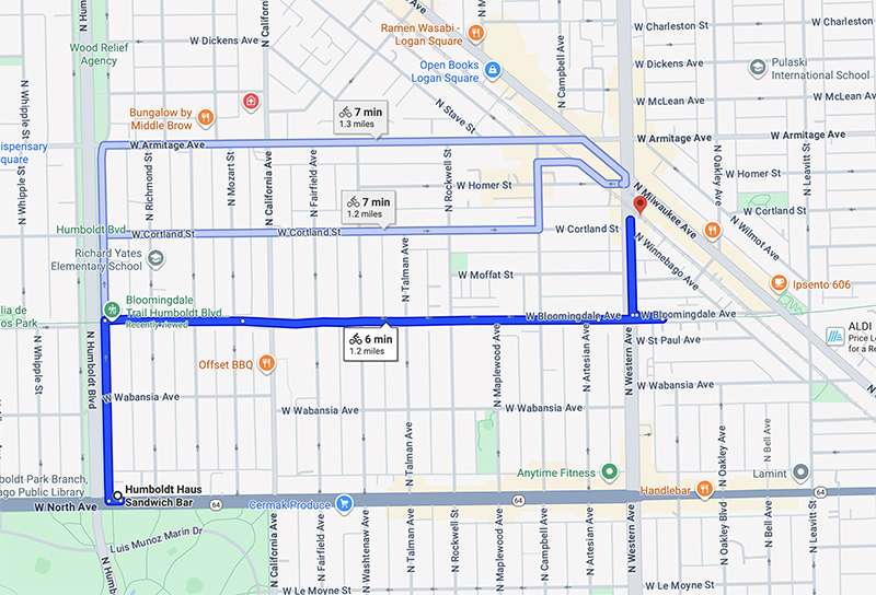 There was this nice mosaic on the corner of Humboldt Blvd. and Wabansia. It’s by Hector Duarte, I guess in honor of the fact that L. Frank Baum lived on that corner in 1899. Somehow we didn’t notice the yellow brick, but I even recorded them in my picture.
