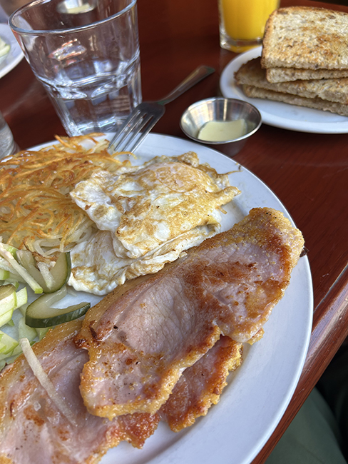 Thursday our first movie wasn’t until 2:30, so in the morning we got up and walked towards Saint Lawrence Market. We had breakfast at Le Petit Dejeuner, a bar that serves breakfast food that we had always walked by when we stayed at Adam’s loft near the Market in 2015 and 2017. We ate there in 2023, also sitting outside. This year we were happy to be inside because there was a picket line and a jack hammer going outside, support staff at George Brown College protesting their treatment amidst construction. So nicer to be inside.