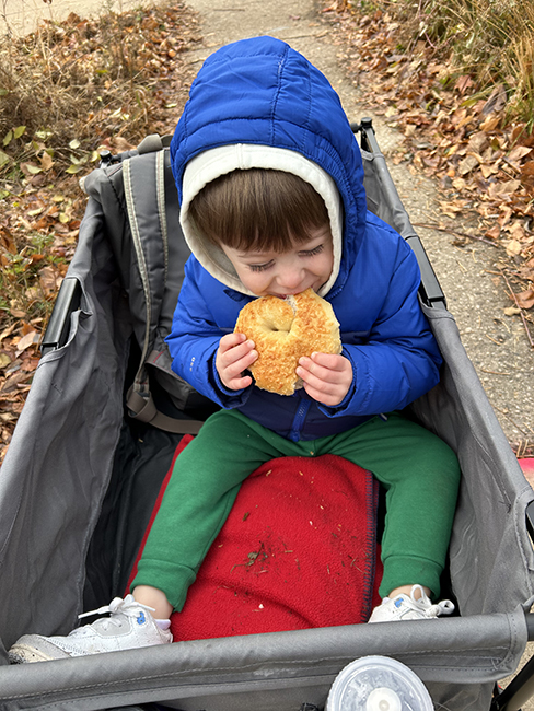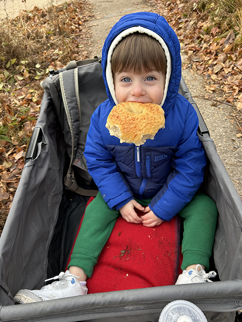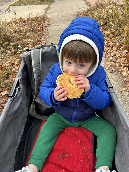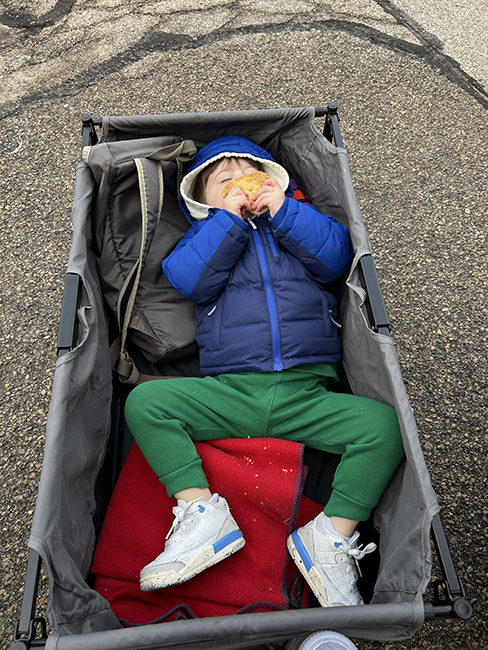 The week before, it wasn’t so cold and we went to the East side to pick up Mermaid Kitchen bagels, because they only deliver to the West side on Sundays. It was Jasper’s really birthday and I gave him a wagon. He was disappointed at first – I told him we were going to the garage to get a present and instead of a wrapped box, there was the wagon. I think he enjoyed riding in it, though, especially with a bagel.
