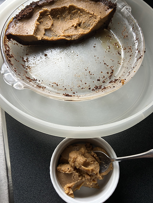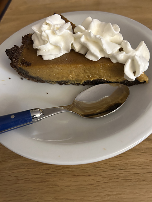 About 10 days ago, I made a pumpkin pie with a crumb crust using some chocolate graham crackers that were lurking in the pantry closet. It was pretty good at first, the crust got a little too brown on the edges, and it confirmed that I prefer graham cracker crust with a pumpkin pie – the chocolate and pumpkin did not marry well – and it got pretty soggy after a week. On Tuesday I scraped out most of the filling and put it in a ramekin, and had it for breakfast. That was good but made me miss the small cup of pumpkin mousse that was my traditional Thanksgiving morning breakfast for many years. I haven’t made the pumpkin mousse the last few years, because Al & Emma have been hosting and they prefer a traditional pumpkin pie, That I have
