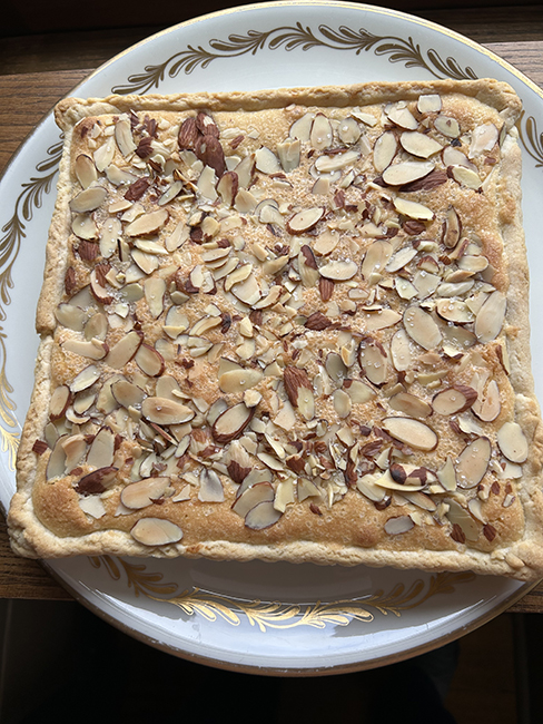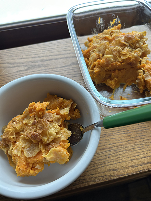 Al & Emma hosted Thanksgving, and it was potluck. I made Chex mix, the aforementioned cranberry bakewell tart, a layered squash & greens gratin with coconut milk instead of heavy cream, but still a bit of cheese on top, regular mashed potatoes & vegetarian gravy (this cider & caramelized onion gravy from Food52, that I’ve been passing off as veg gravy for the last few years, made with veggie stock, way less trouble than the one I used to make from Gourmet where you have to make a special rich veggie stock), and the spicy sweet potatoes, with buttered cornflakes on top. Since John and Megan did come for Thanksgiving despite John’s ankle, Megan made stuffed dates & Brussels sprouts. John watched the Packers from the couch while we cooked.