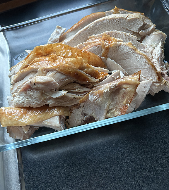 I froze about 3 pounds of the turkey to make BBQ turkey for the cookie party. That left us a nice dish of breast slices for sandwiches last night, and the rest I’m trying to decide what else to do with.