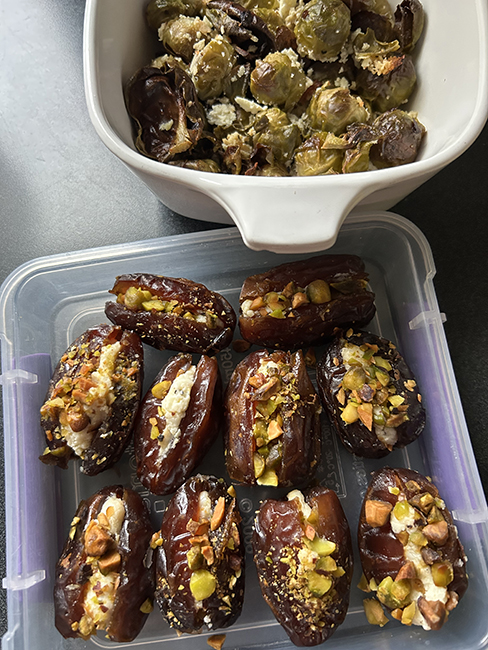 Brussels sprouts roasted atop goat cheese, stuffed dates