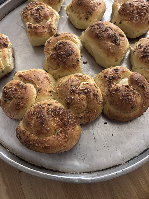 Garlic knots made from the same dough as the dogs. They got a little overbaked