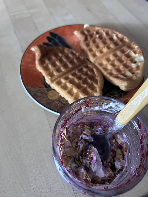 In between I ate probably too big of a breakfast: homemade freezer waffles and yogurt with blueberry compote and granola, and I think I had a blueberry muffin as well.