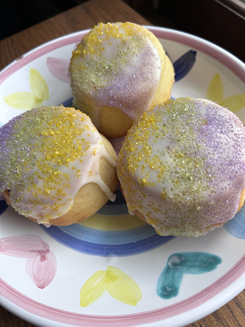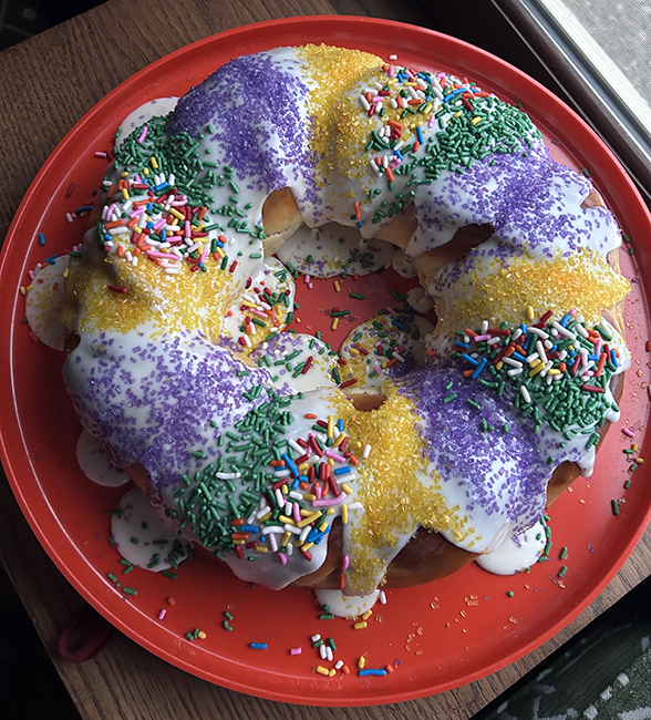 I made individual almond-filled (a mixture of almond paste and breadcrumbs with of course some butter in there, too) King Cakes to share with poll workers. Jasper helped. He seemed to like the almond filling, too. I just ate the last one for breakfast, Sunday following. The funfetti cake was more dramatic, but these little guys tasted better.  To me. I like an almond filled King Cake.