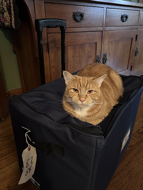 George likes sitting on the tote of election supplies