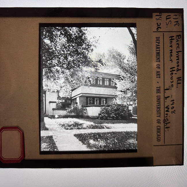 One of the pieces includes a case of glass lantern slides for teaching art history, a room where the slides are projected, and individual digitized slides like this Frank Lloyd Wright house
