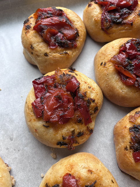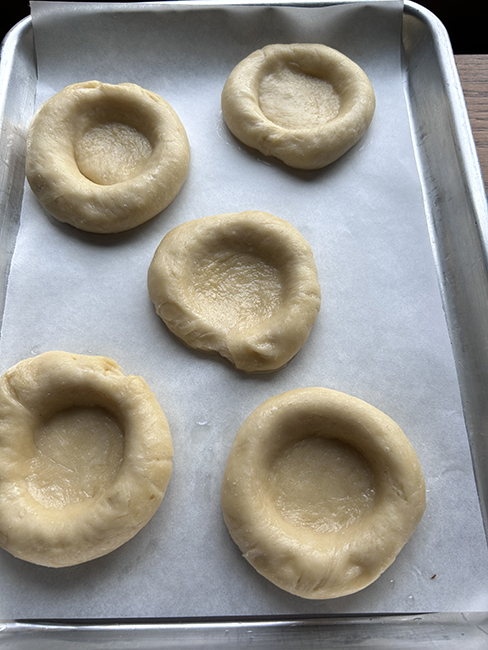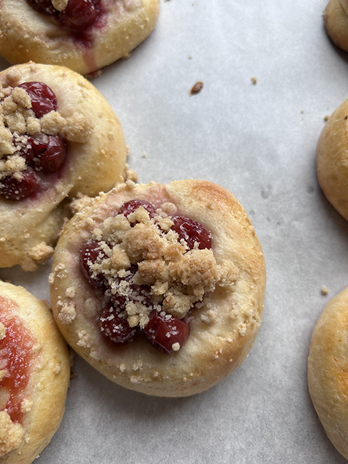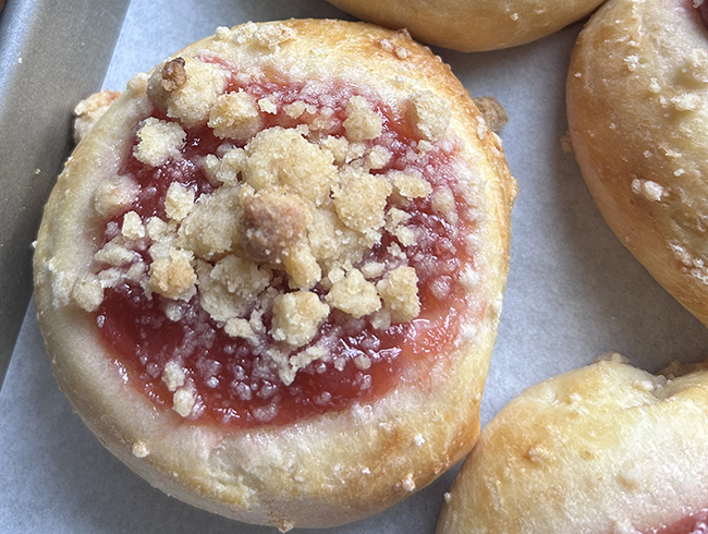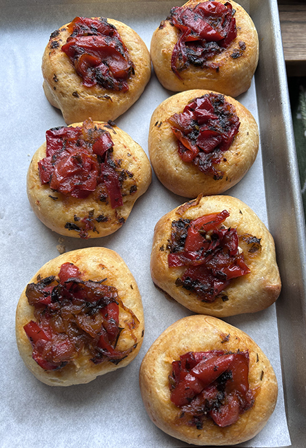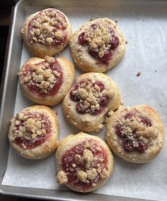 First, a week ago Sunday’s cooking class. Savory and sweet kolaches. The sweet ones are rhubarb and cream cheese, and some with cherries and some with cherry jam. The savories have pepperonata and goat cheese.